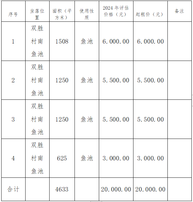 为加强改善国有资产低效使用问题,经抚远市国有资产监督管理办公室批准,委托评估公司评估定价后,以网上竞拍方式集体打包出租2024年双胜鱼种场4个鱼池使用权,现就有关事项公告如下: