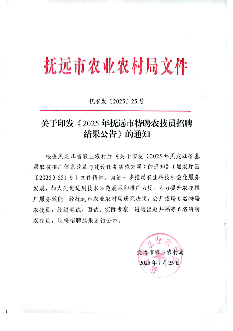 关于印发《2025年抚远市特聘农技员招聘结果公告》的通知