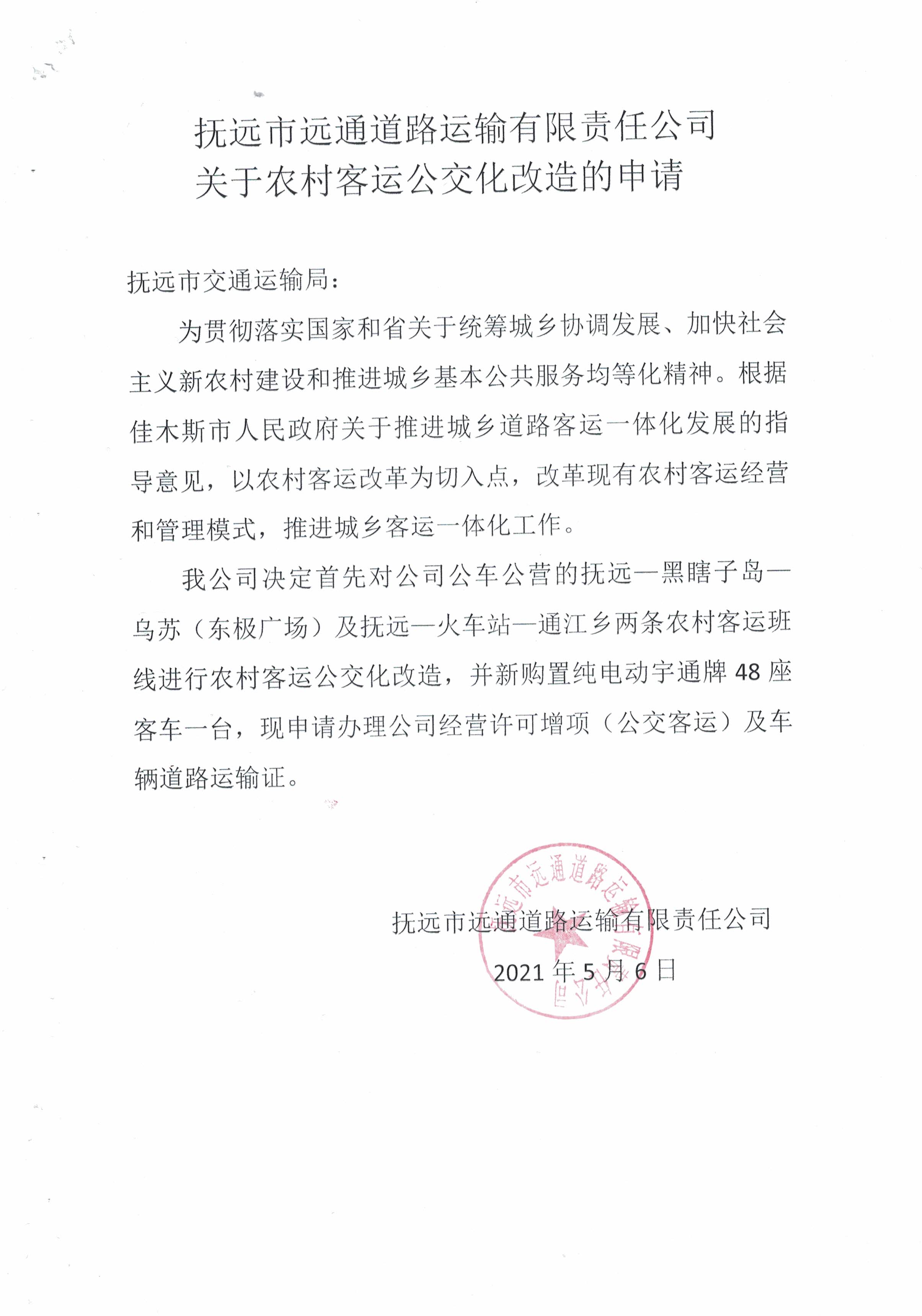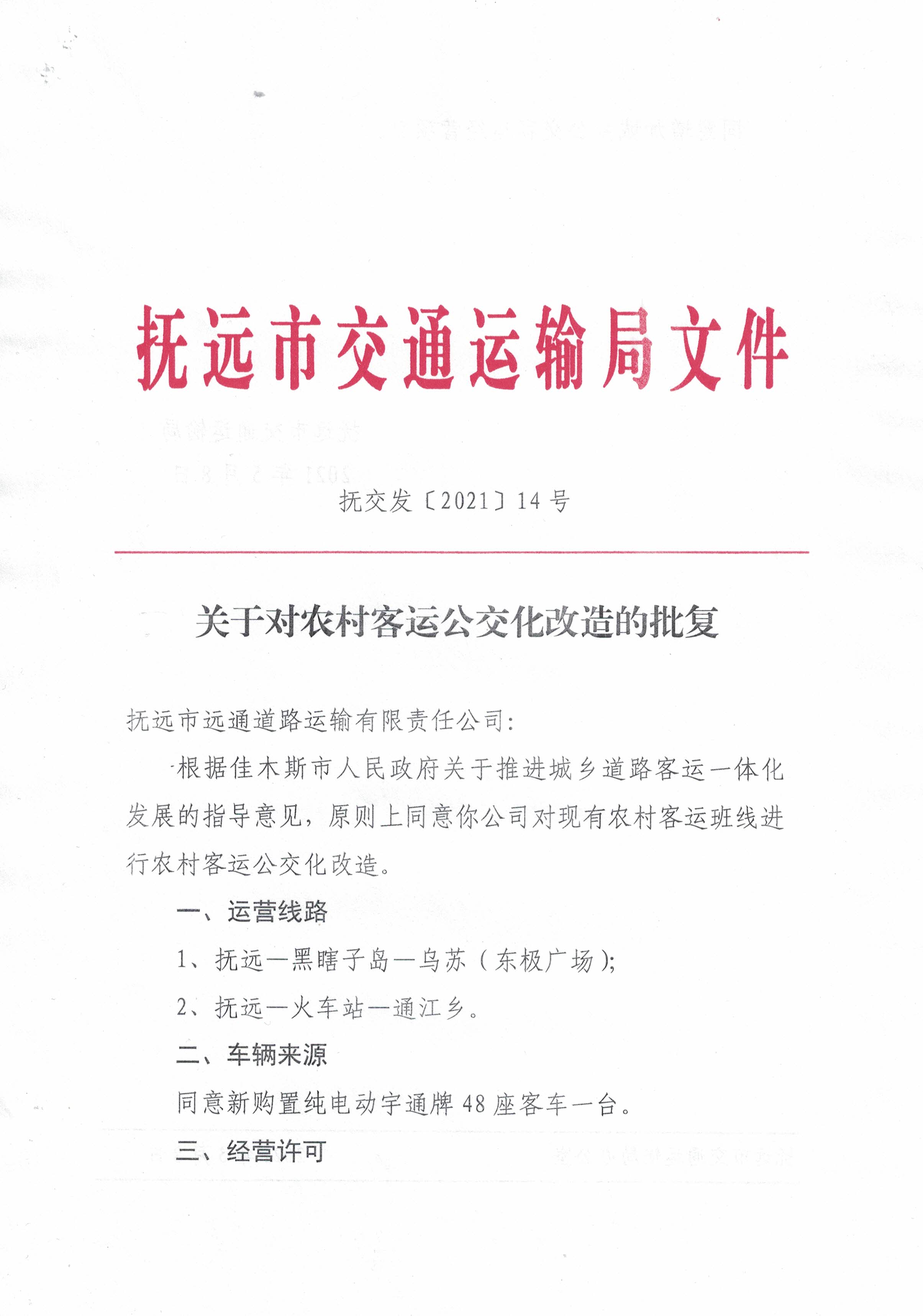 为贯彻落实国家和省关于统筹城乡协调发展、加快社会主义新农村建设和推进城乡基本公共服务均等化精神。根据佳木斯市人民政府关于推进城乡道路客运一体化发展的指导意见,以农村客运改革为切入点,改革现有农村客运经营和管理模式,推进城乡客运一体化工作。决定新增两条农村客运班线,现对《申请》及《批复》内容进行公示,接受社会与群众监督执行。具体内容如下: