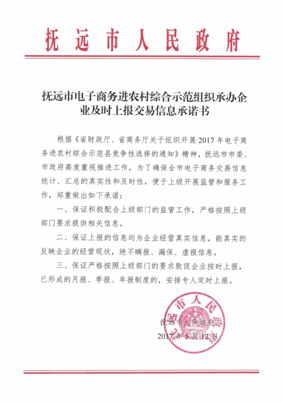 抚远市电子商务进农村综合示范组织承办企业及时上报交易信息承诺书