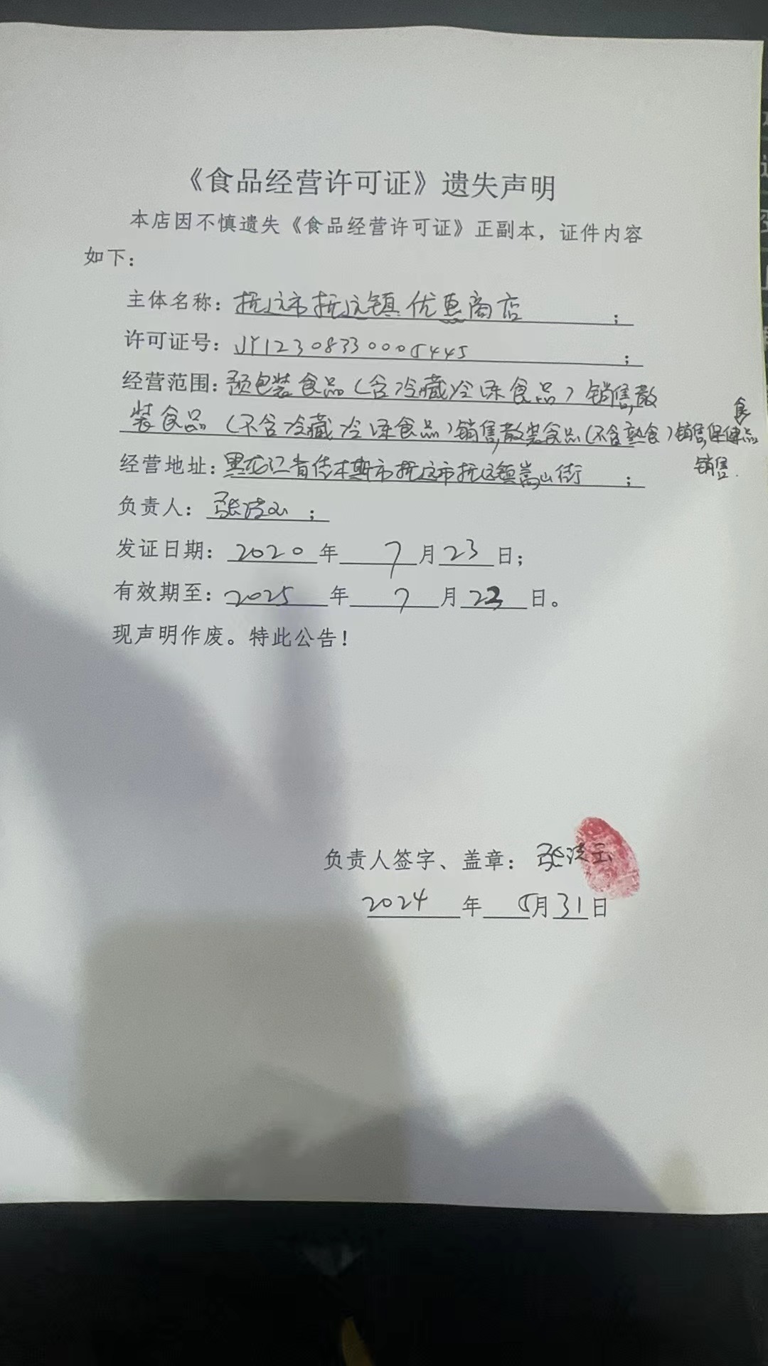 《食品经营许可证》遗失声明(2024.5.31)(1)