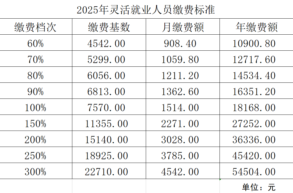 根据黑龙江省人社厅《关于确定2025年度基本养老保险使用的全口径就业人员平均工资的通知》(黑人社函〔2024〕548号),黑龙江省2025年度全省缴纳基本养老保险费及计发基本养老金使用的上年度全口径城镇单位就业人员平均工资为90840元,上年度全口径城镇单位就业人员月平均工资为7570元。据此测算2025年度个体及灵活就业人员缴费档次如下: