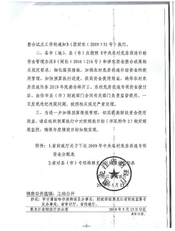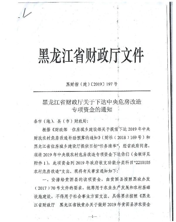 行业主管部门管理的扶贫资金(黑龙江省财政厅关于下达中央危房改选专项资金的通知(黑财指(建)[2019]197号))
