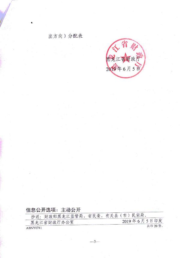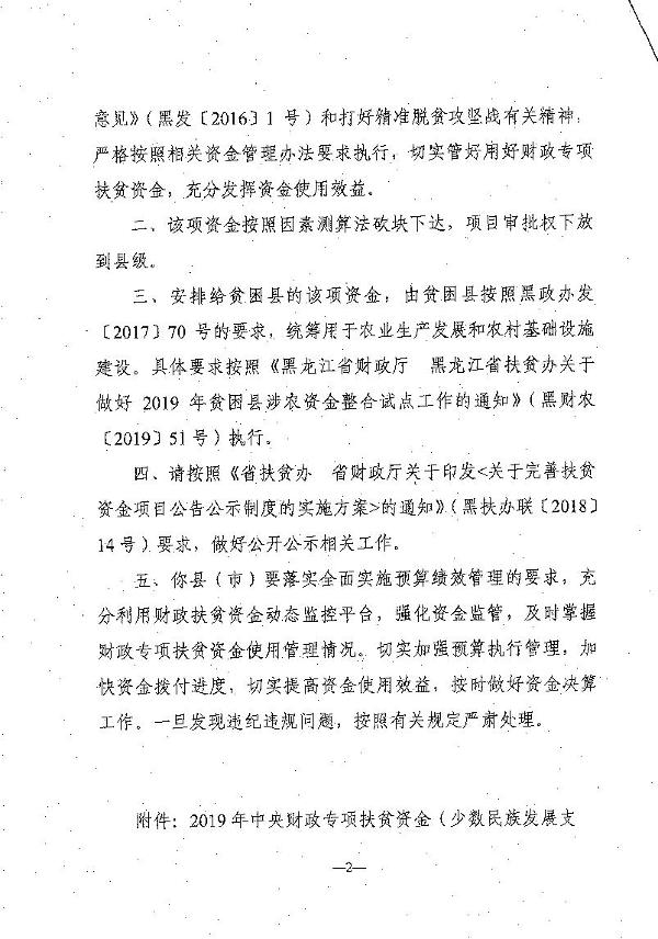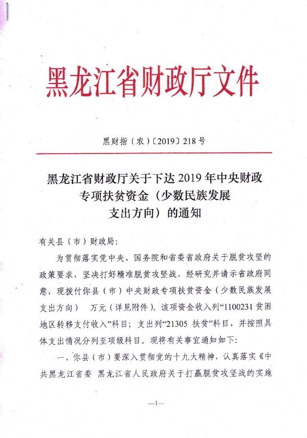 黑龙江省财政厅关于下达2019年中央财政专项扶贫资金(少数民族发展支出方向)的通知